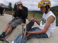 Safety Equipment leads to longer practice sessions and fewer injuries. Skate pads on the knee and elbow protect not only knees and elbows, but also other parts of the body from injury. Skaters can learn how to “bail,” or step off the skateboard, and slide on the kneepads, or use the pads to spread out the force of the impact. Helmets should fit snugly, with no wiggle, and the chinstrap not too tight, adjusted for comfort. Bike helmets should not be used for skateboarding, as they don’t protect the back of the head as well, and are usually rated for one impact only before retiring them. Skate helmets are designed to take multiple small impacts and remain protective over time. Wrist guards are a great idea for beginners. Good court shoes, preferably skateboard shoes, are a must. Sandals are never appropriate.