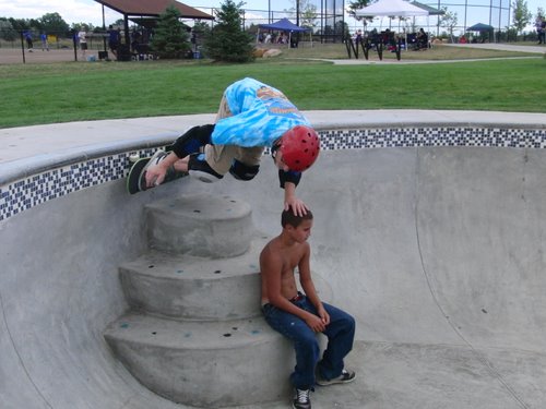 I was skating the other day in Fort Collins, Colorado – there’s this great new park with a backyard pool replica – and learned how to go over the stairs in the shallow end. We were skating with some local kids when I had this idea: could I use someone’s head to pivot around? Wouldn’t that look cool! Well, here’s the result.